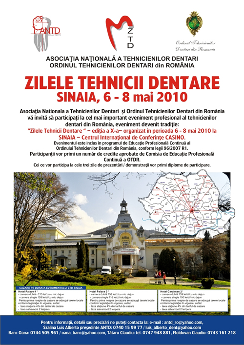 Asociatia Nationala a Tehnicienilor Dentari va invita sa participati in perioada 6 - 8 Mai 2010 la Zilele Tehnicii Dentare, editia a X-a, ce va avea loc la Centrul International de conferinte "CASINO" din Sinaia.